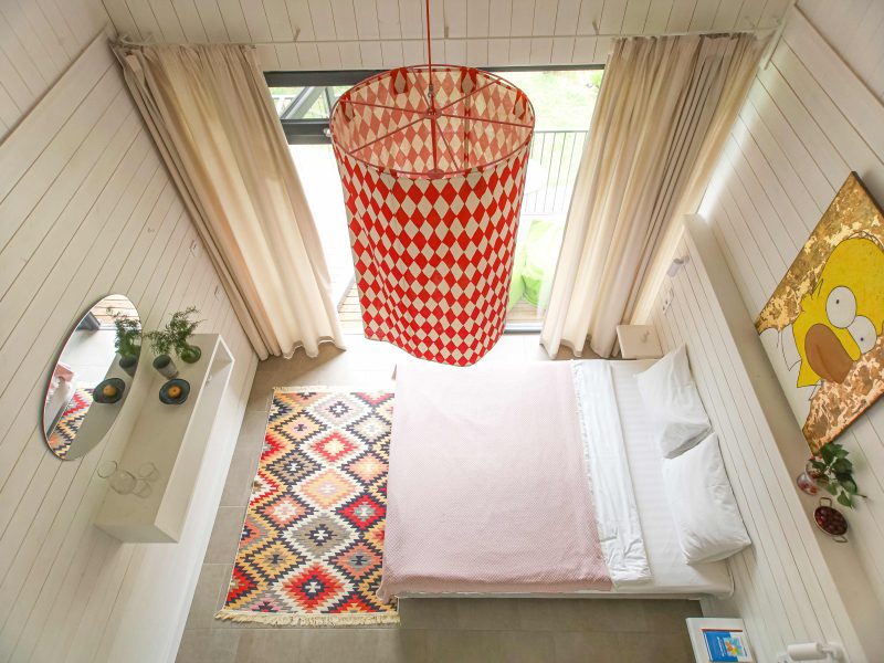 Просторный двухкомнатный номер для двоих взрослых и двоих детей, с отдельным выходом на балкон второго этажа. Теплая зеленая гамма, белый деревянный пол и… искусство в интерьере. Вам понравится!
